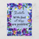 Customisable name postcard with the inspirational and encouraging bible verse "With God all things are possible." from Matthew 19:26, with watercolor painted blue and purple pansy flowers.