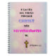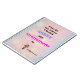 A notebook with a spiritual themed quote. Quotation from the Christian Bible which reads: "I can do all things through Christ who strengthens me. Philippians 4:13". Bright and cheerful font and typography with a wooden cross illustration at the bottom. Uplifting, inspirational and motivational words of faith. The background is a delicate misty pastel pink with some faded faint white daisies.