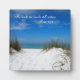 Bring peace and inspiration into any space with this beautifully designed 5.25” x 5.25” tabletop plaque. Featuring a serene coastal scene, the image captures a white sandy beach with two gentle sand dunes topped with soft sea grass. Beyond, the calm blue ocean stretches beneath a bright, sunlit sky filled with soft clouds, creating a tranquil and uplifting atmosphere.