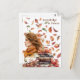 Postcard featuring an inspirational message of Knowledge is Power in the upper right of card with a watercolor illustration of a girl with wind swept hair and a stack of books among blowing swirling leaves in muted fall colour tones.  The blowing leaves illustration is repeated on the back of card in lower left corner.  A postcard with an encouraging message for students and adults.