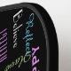 Pickleball - the new rage! Delight grandma or grandpa with a this inspirational, motivational pickleball paddle! Phrases, which can be personalised, include "Believe", "Relax", "Be Positive", "Stay Strong", "Live Healthy", "Be Positive", "Enjoy Life", and others. Fun colours on black background. Trim can be black, white, or brown. All Rights Reserved © 2022 Marcia & Alan Socolik.