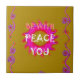 This artwork prominently features the phrase "Peace Be With You" displayed in the centre. The text is stylised and surrounded by a decorative floral border, creating a balanced and symmetrical composition that draws the eye to the uplifting message. A solid colour background provides a clear contrast, enhancing the overall design.