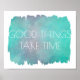 This inspirational poster art has good things take time quote motivational white text on watercolor style shades of blue, teal, and turquoise paint strokes for decor in home or office. Original art copyright Ann Powell all rights reserved.