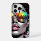A phone case that depicts an African-American woman wearing sunglasses that reflect the city's skyline. She is standing against a wall full of graffiti street art and the whole illustration is in black and white except her sunglasses and the wall behind her is in color.