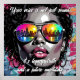 A poster with an inspirational quote that depicts an African-American woman wearing sunglasses that reflect the city's skyline. She is standing against a wall full of graffiti street art and the whole illustration is in black and white except her sunglasses and the wall behind her is in color.