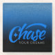 Offer inspiration with this coaster, which features the uplifting words/advice "Chase your dreams"", rendered in a combination of handwritten and elegant serif lettering on a royal-blue-to-black gradient background.