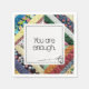 Diagonal cotton calico patchwork quilt pattern with needle, black thread, and stitching border on a white background featuring an inspiring quote.