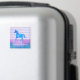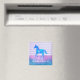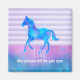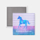 A magnet with an inspirational quote with a horsey theme. The quote says Live like someone left the gate open. With an image of a watercolor horse running free. Painted in blue and purple watercolors. The background is vintage purple stripes with a blue and pink watercolor border.