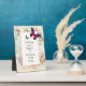 An inspirational quote which says: Follow your heart, it knows the way. Designed with an elegant pink magenta butterfly with purple accents and a smaller green butterfly following along. A white frame with a gold coloured border is layered over top a shabby vintage collage with pink roses and other decorative elements. A charming and whimsical motivational saying.