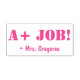 This inspirational rubber stamp design features the motivational message "A+ JOB!" and a personalised teacher name. It could be used by a teacher or educator when grading student work, to acknowledge that a student has done an exceptional job.