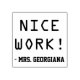 This fun rubber stamp design features the message "NICE WORK!" and a custom educator's name. It could be used by a teacher, educator, or tutor when grading student work, to indicate that a student has done an exceptional job.