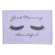 Black eyelashes with an uplifting quote on a pastel purple and white pin dot pattern.