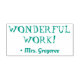 This fun rubber stamp design features the encouraging message "WONDERFUL WORK!" and a personalised teacher's, educator's or tutor's name. It could be used by a teacher, educator, or tutor when marking assignments, to acknowledge that the student has done well.