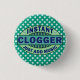 This cute button design for clog dancers says "Instant Clogger: Just Add Music." It's an oval-shaped design in shades of green, blue and white with music notes and stripes. The background is blue-green with white polka dots. It's a pretty button for the dancing fan. See variations and more clogging designs at our shop link!