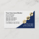Insurance broker or agent business cards with off white background colour you can customise and blue modern design element, along with image of a home, automobile, and business symbol representing home owners insurance, medical insurance, and business insurance. Designed for an agent, agency, independant rep, or brokerage.
