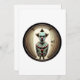 Colourful sad punk clown standing in a narrow doorway, looking directly at the viewer. The clown has sharply styled upward hair, a red nose, and a classic clown costume adorned with red details. His expression is intense, creating a slightly unsettling yet dynamic design. The background is minimalistic, emphasising the power of the clown’s gaze.
