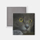 A close-up shot of the face of a grey cat with yellow eyes and dilated pupils, resting his head on his paw and staring intently at something behind the camera.
