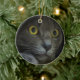 A close-up shot of the face of a grey cat with yellow eyes and dilated pupils, resting his head on his paw and staring intently at something behind the camera.