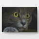 A close-up shot of the face of a grey cat with yellow eyes and dilated pupils, resting his head on his paw and staring intently at something behind the camera.