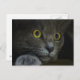 A close-up shot of the face of a grey cat with yellow eyes and dilated pupils, resting his head on his paw and staring intently at something behind the camera.