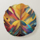 A vibrant array of bold, geometric shapes converges at the centre, forming a symmetrical and colourful composition. The piece uses a variety of hues, ranging from warm yellows and oranges to cool blues and purples.