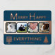 These simple 4 photo greeting cards in navy with real rose gold foil printing are a cute choice for your interfaith family. A Hanukkah menorah on the left and a stylized Christmas tree on the right paired with simple modern fonts keep the MERRY HAPPY EVERYTHING design uncluttered and showcases your family's pictures. These interfaith holiday flat cards reverse to a medium blue with the option to add an additional message for your blended Christmas and Hanukkah celebrations. The real rose gold foil printing adds a bit of elegance as you embrace the faiths.