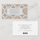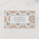 An earthy boho style business card design with muted brown grey and black hues with a central name plate for an interior designer and home residential or commercial stager. The back side of the card continues a solid grey taken from the pattern on the front.