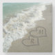 Elegant Sand Hearts written in the Beach nice to symbolise a Destination Wedding or tropical honeymoon travel vacation. Beautiful scenic image of clear aqua turquoise ocean water, with white waves crashing on the tan sand beach. Two interlocking hearts symbolise eternal love, even put your custom first or last name initials inside the hearts!