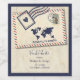 This design captures the spirit of wanderlust and love, blending vintage travel aesthetics with rustic charm. Featuring classic airmail stripes in red and blue, muted beige tones, and subtle map textures, it evokes the feeling of setting off on a grand romantic journey. Elements like postage stamps, world map details, and retro styling make it perfect for couples who dream of a global celebration filled with adventure, connection, and timeless elegance.