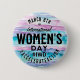 March 8th is International Women's Day. Spread the word and show off your support for equality and progress wearing this button. #IWD #InternationalWomensDay Purple and teal background.