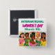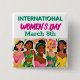 A button for International Women's Day with pop art tropical women on it in pink, green and yellow.