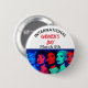 A button for International Women's Day with pop art women on it. Red, blue, teal and black abstract women graphics.
