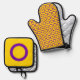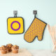 A repeating pattern of the pride flag for intersex people (a purple ring on a yellow background) on the mitt and a single ring on the pot holder.