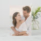 This wedding invitation features a tender moment between a couple embracing, both dressed in white, creating a harmonious and serene colour palette of whites and light beiges. The soft, blurred background suggests an idyllic beach setting with hints of waves and sky, enhancing the naturalistic style that emphasises warmth and intimacy. The photographic representation captures a candid, joyful interaction, conveying a mood of happiness and tranquillity. Perfect for couples seeking an elegant and heartfelt design to celebrate their special day.