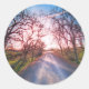 Moving fast towards the light down a country road. Trees blurred from acceleration.