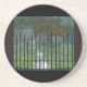 A 3D landscape in early autumn, depicting a path wandering up through the grass into a misty forest of old and gnarled trees. But the overgrown pathway is barred by a gate of black iron spikes between dark brick walls. Created in Vue.