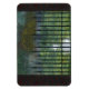 A 3D landscape in early autumn, depicting a path wandering up through the grass into a misty forest of old and gnarled trees. But the overgrown pathway is barred by a gate of black iron spikes between dark brick walls. Created in Vue.