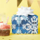 Symmetrical and artistic snowflake in vibrant blue tones, featuring intricate geometric shapes and frosty design elements against a white background, evoking a sense of winter and festive beauty.