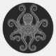 An intricate octopus design decorated with gray swirls and dots. The symmetrical pattern has all eight of it’s legs outstretched and it’s eyes looking forward. The octopus sits on a pure black background creating a subtle contrast on the surface of this sticker. The body and arms of the octopus are comprised of delicate lines that come together to form a stunning pattern. This stylish design is a beautiful take on this strange and wonderful sea creature.