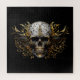 This image features an intricately designed skull adorned with tribal patterns. The artwork predominantly uses a black and gold colour scheme, giving the piece a luxurious and gothic feel. The skull is detailed with ornate, swirling designs and is surrounded by elaborate, abstract shapes, enhancing its tribal aesthetic. The meticulous detailing and rich colours make this digital illustration a striking piece of art, perfect for fans of dark and decorative themes or as inspiration for tattoos.