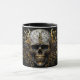 This image features an intricately designed skull adorned with tribal patterns. The artwork predominantly uses a black and gold colour scheme, giving the piece a luxurious and gothic feel. The skull is detailed with ornate, swirling designs and is surrounded by elaborate, abstract shapes, enhancing its tribal aesthetic. The meticulous detailing and rich colours make this digital illustration a striking piece of art, perfect for fans of dark and decorative themes or as inspiration for tattoos.
