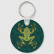 This tribal tree frog is decorated with intricate golden yellow swirls and dot patterns. The interior of the frog is painted a deep blue color that is echoed in the background giving the pattern a beautiful contrast. A shadow falls just beneath the symmetrical tree frog making it appear to float just above the surface of this keychain. This stylized design is a striking representation of this wonderful little creature.