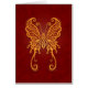 A tribal butterfly card design decorated with intricate swirls and dot patterns. The complex lines and circles are colored with a golden red that is highlighted to create a light shine on the surface. The interior of the wings and body are finished with a deep red that is repeated in the background, creating a beautiful, subtle contrast. A shadow falls just beneath the delicate butterfly making it appear to float just above the surface of the card. This stylized design is a striking representation of this wonderful little flying creature.