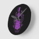 Intricate Purple Bass Guitar Design on Black Round Clock