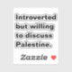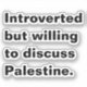 This is a special "Introverted but willing to discuss Palestine" saying design For Palestinians, Palestine lovers Pro-Palestinian, or, everyone who supports freedom and justice and fights injustice. To all supporters of the just Palestinian cause. Rise and support the liberation of Palestine and Gaza and the establishment of peace in Jerusalem. Designed by Peace Lover designers. Stop the Palestine-Israel conflict. Palestinian lives matter. (YOU CAN CHANGE AND CUSTOMIZE THIS TEXT DESIGN!).