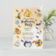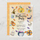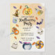 This Halloween invitation features a watercolor-style layout with various themed illustrations, including a carved pumpkin at the top, candy pieces, bats, a potion bottle, skulls, a ghost, a cauldron, and other classic Halloween icons arranged around the text area. The centre section contains customisable event details such as date, time, location, and RSVP information, all set against a light textured background that highlights the artwork.