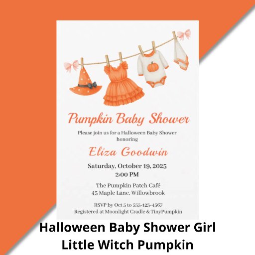 Celebrate your little pumpkin with this Halloween baby shower girl design in festive orange and black. A spooky cute invitation with pumpkin and witchy details, perfect for a fall shower.