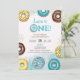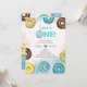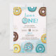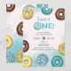 Flat 1st birthday invitation card, decorated with an image of sweet, yummy doughnuts.