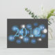 Year is superimposed over 3D bubbles in blues and white, on black background. (Change date for the new year) Back: "Where will you be when the clock strikes 12? Come join us for a New Years party" with clock face in lower left corner. Personalise with host, location, time and rsvp information
