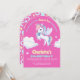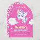 Invitation to a magical birthday party with an adorable unicorn with wings in the clouds on a rainbow background.